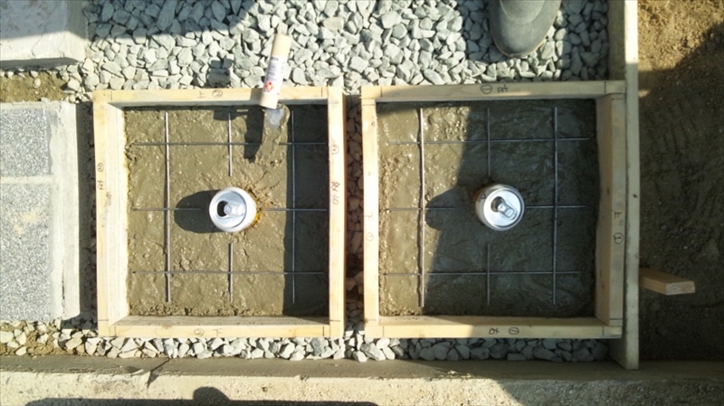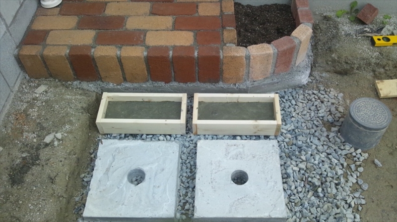 さてブロック構築を急ぎます。たたきができた為、通常のサイズのブロックは入らなくなり、レンガ一列分の基礎(捨てコン)を作ります。(こんなに細いと車が乗った時に倒れそう。) |