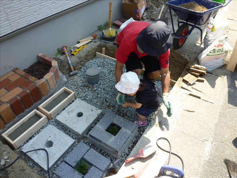 さて、先を急ぎます。ここにもブロックを作ります。バラスを敷いて、突き固めました。 |