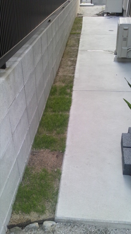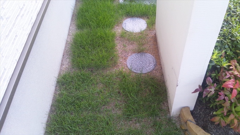 その前に芝生の成長具合。芝生貼り1(6/5)に貼った芝生。1か月と3週間経過。ここはとても順調です |