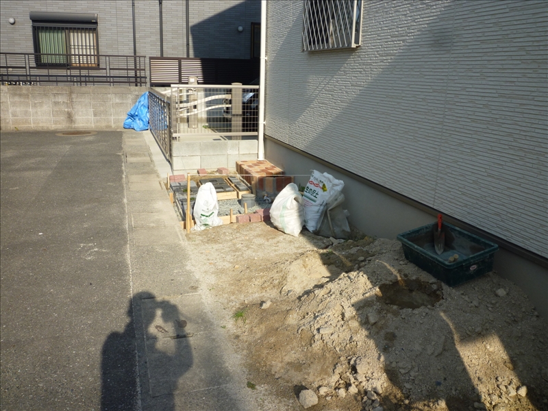 今回は、左側2段目の2つのレンガを固定しました。この日も相当な時間を費やし、2つだけでした。目地入れが大変!(何か対策を考えなければ!!) |