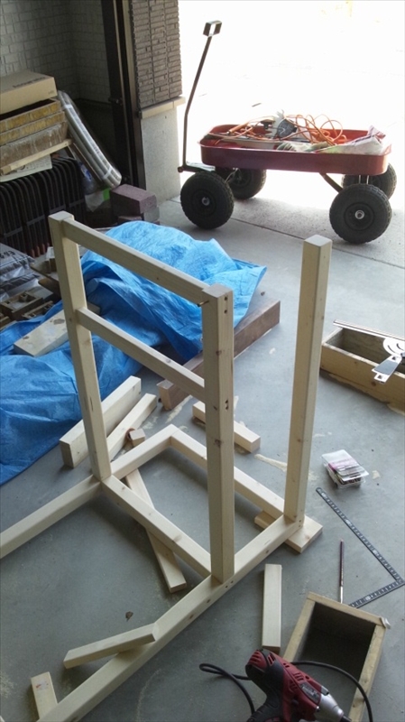 まずは土台。サンダーを掛け、2×2材を四角に組みます。 |