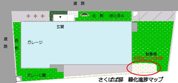 (記事にはしてませんが、南側の細い個所は水はけが悪く。芝生が育ちませんでしたので、緑化は断念しました。)