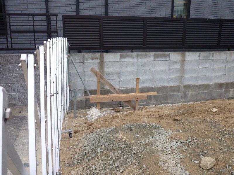 駐車場(兼庭)あたり。 何を立てているのでしょうか? 四隅にあるようです。