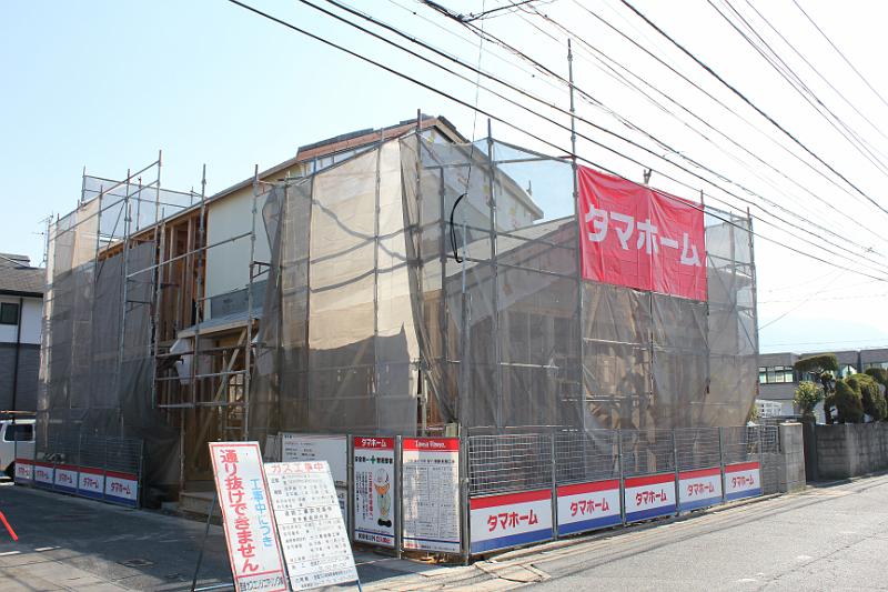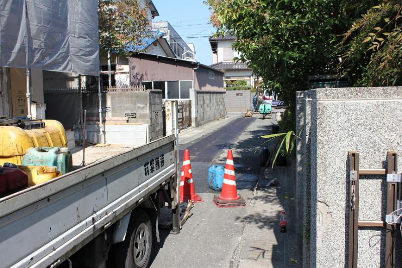 この角度がさまになってきました。が、昨日と変わりありません。通り抜け出来ませんの看板があります。2軒先のH建設の現場へのガス引き込み工事のようです。 |