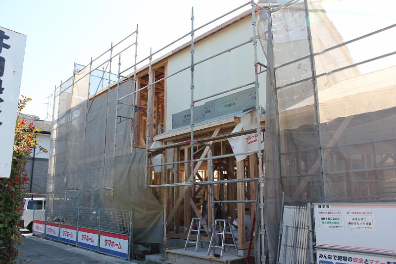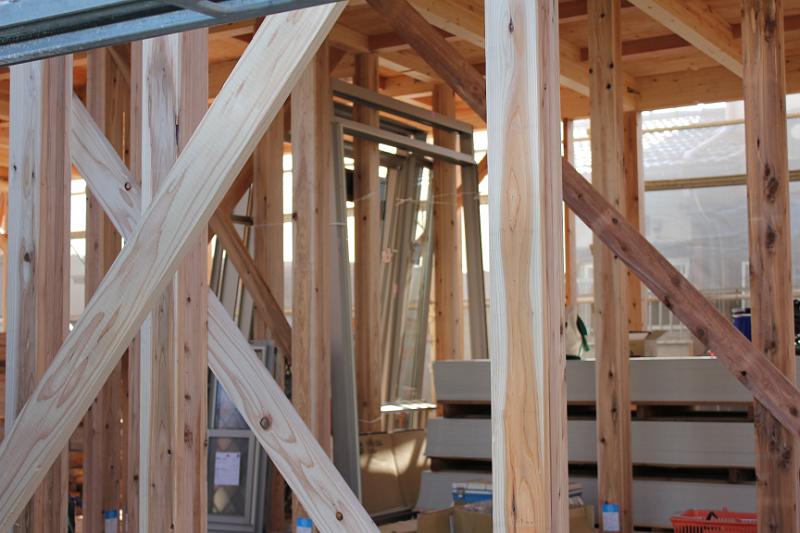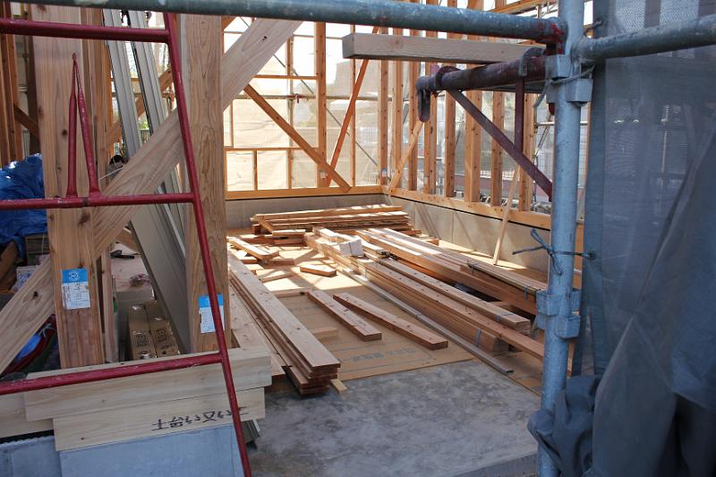 今日も晴れ。昨日上棟でしたが、今日は大工さん4名来られていました。昼少し前に偵察しましたが、今日はサッシを入れる準備をしているようです。
