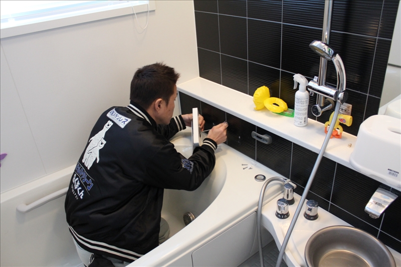タイルに穴があいていて、穴の周りは防水の為の両面テープ。左右をビスで固定してます。 |